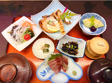 〔西京焼き・刺身・茶碗蒸し・サラダ・小鉢・香の物・ご飯・味噌汁・フルーツ〕