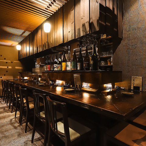 元住吉駅より徒歩3分。落ち着いた照明と石畳でムードたっぷり。木の温もり感が居心地の良さを演出♪お客様の串焼きの食べるタイミングに合わせて串焼きを焼き上げます。