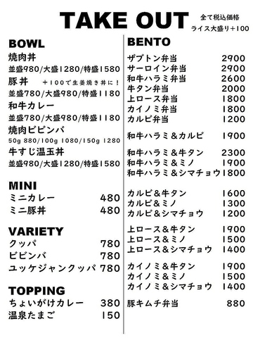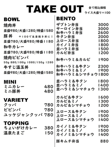 - お弁当以外はすべて税抜価格です。お弁当のお肉は店内で焼いてご提供いたします。※1人前100g、ライス200g *お弁当ライス大盛り(300g)+100円。その他お食事お気軽にご相談ください。*レジ袋有料化になります。S3円、M5円、L10円。マイバックのご持参にご理解ご協力お願いします。