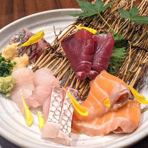 当店の鮮魚部門人気1位の「おまかせ刺身五点盛り」!新鮮魚を毎日目利きし、豊富な種類でご提供いたします!生魚の持つ本来の旨味を是非、ご堪能ください!※天候や仕入れ状況により写真と内容が若干変わる事がございます。あらかじめご了承ください。