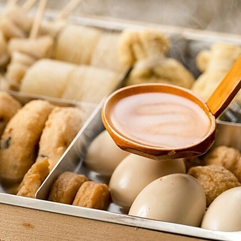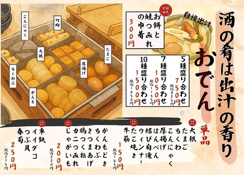 料理人が丁寧に仕込んだ、香り高い出汁が自慢のおでん。その風味豊かな出汁は、具材の一つひとつにしっかりと染み込み、深みのある味わいを生み出しています。老舗の味を彷彿とさせる、心温まる一品です。