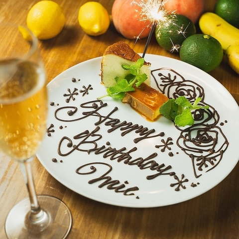 記念日には、特製のデザートプレートをご用意いたします。事前のご予約で、コース利用時にプレゼントしておりますので、サプライズにもぴったり。美味しい料理とお酒を楽しみながら、思い出に残る一日をお過ごしください。