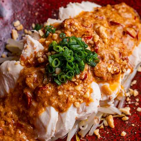 自家製の山椒と唐辛子が効いた特製だれがかかった蒸し鶏です。鶏むね肉を低温調理で蒸しております。かなり刺激的なので辛党ではない方には辛さを控え目にした「マイルド味」もご用意!