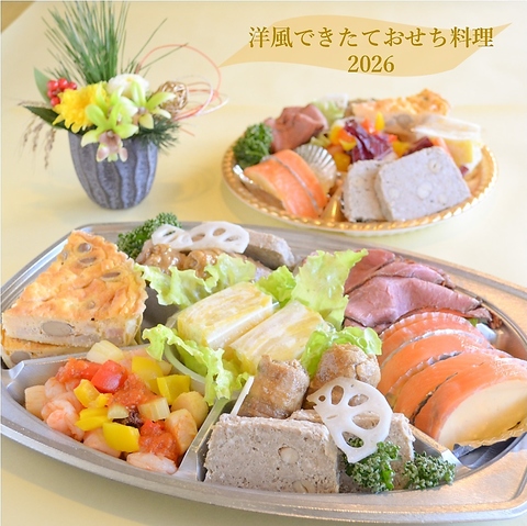 お料理やデザートをご自宅でお楽しみいただける 『Dinner Box』 ※ランチでもディナーでもご注文いただけます。内容:お肉料理×1、オードブル×1、デザート×1、パン(バケット×2)のセット(メニューの内容は日替わりになります)<ご予約受付:お引き取りの2日前まで、Xmas期間は3日前まで>