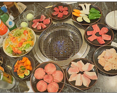 店主オススメの宴会コースを新しくご用意しました☆牛タン塩、幅広い年代に人気のヤングカルビ、ロース、とんとロ、キムチ盛り合わせ・・デザートもついて満足度100%★+2000円で2時間飲み放題おつけできます!!※2名様より受付となります。(写真は1例です)