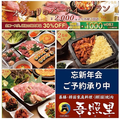 吾照里おすすめのオリジナルセット!選べる肉料理をジューシーに鉄板で焼き、サンチュを韓国味噌のサムジャンを付けて、ねぎムチム、季節の新鮮野菜に包んで♪大人気の焼肉コースはサムギョプサルやチヂミ、焼肉3種盛り合わせ等、人気メニューの詰め合わせ!品川でのご宴会、焼肉には是非一度ご賞味下さい。