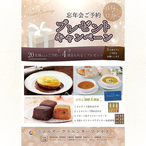 20名様以上ご予約のお客様へ、豪華4商品をプレゼント!この機会にぜひ!【予約期間】11/14~12/26迄