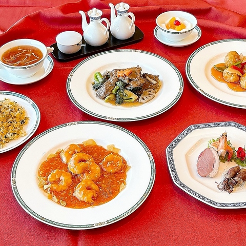 【水晶(すいしょう)】コース全7品6,000円。人気のふかひれスープからデザートまで堪能できるデートや記念日におすすめの本格的な中国料理コース。