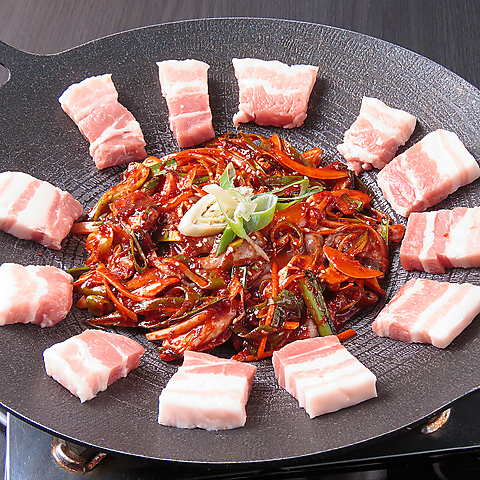 香ばしく焼き上げた厚切りの豚バラ肉を、たっぷりの野菜や薬味と一緒に楽しめる「鉄板チュサムギョプサル」