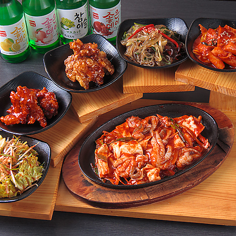 「天国への階段プレート」!人気韓国料理5品のお得なセットご準備しております!!トッポギ、チャプチェ、フライドチキン、ヤンニョムチキン、サラダの5品に加えて、鉄板料理1品をご選択可能です♪
