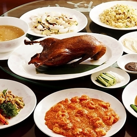 (半羽)¥8,800 (一羽)¥15,400 代表的な人気料理の「北京ダック」。職人技が光る極上の逸品。パリッと香ばしい皮にジューシーな旨味が凝縮され、甜麺醤や薬味と重なり合う奥深い味わい。見た目も華やかで、まさに中華の王道を極めた一皿。接待や記念日にふさわしい至福の逸品です!北京ダックが楽しめるコースも◎