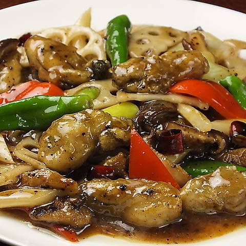 他店ではなかなか味わうことのできない、こだわりのお野菜をヘルシーにさっぱり塩味で炒めてあります。ふくろ茸、セロリとクワイのそれぞれ異なった食感と風味を是非ご堪能くださいませ。