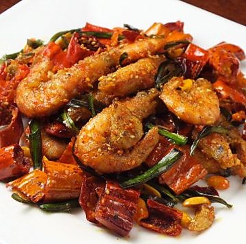 有頭海老を丸ごと中国の唐辛子と共にスパイシーに炒めた逸品。丸ごと食べられる唐辛子は、辛すぎず、風味が食欲をそそります♪是非、ビールとご一緒にお召し上がりくださいませ♪