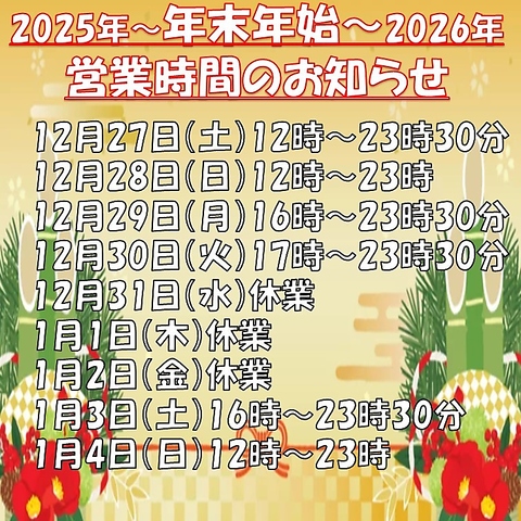 年末年始の営業時間のお知らせ♪大切なご家族とご友人とお食事をするなら、当店へお越しください♪