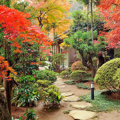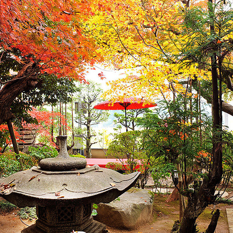 四季の変化をお楽しみいただける庭園。人気スポット樹齢150年のもみじの大木の下での記念撮影も承ります。テーブル席に関しましては、すべての席から日本庭園が見えるお席でお食事をお楽しみいただけます。半個室感覚の仕切り(ついたて)もご用意できます。
