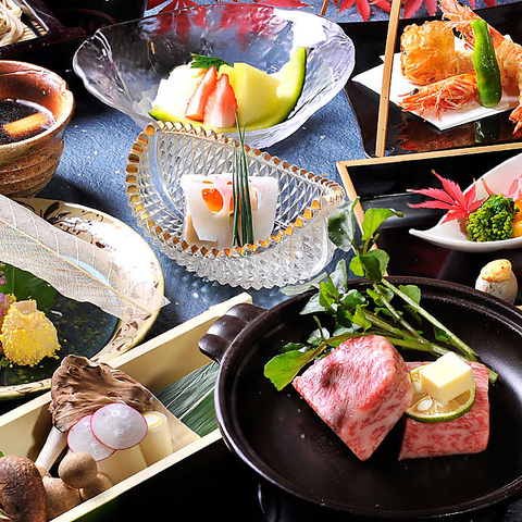 あわびや伊勢海老などの高級食材と市場へ出向いて買い付けた旬を取り入れた、季節感あふれるコース料理は 慶弔の席にもふさわしい。鯛や伊勢海老の姿造りを盛り込んだお祝い用の懐石「吉祥」を始め、献杯用食前酒にお造りなど7品と、〆に石挽手打ちそばとデザートを供する法事用の「夢草」など、多彩な懐石プランをご用意。