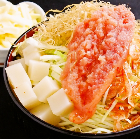 【定番人気】とろけたおもち&明太子のハーモニーは絶妙♪大きな明太子と築地で仕入れたサクラエビが乗った人気のもんじゃです。