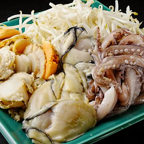 築地で仕入れた新鮮な海鮮盛り(海老1尾・カキ1個・帆立1個・もやし付き)