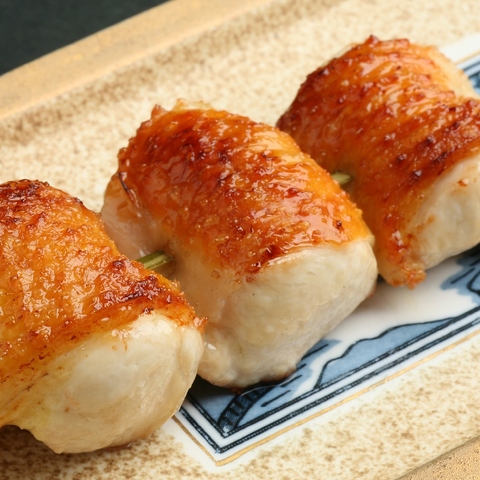 熟成したむね肉を鶏皮で包み炭火でこんがりと焼き上げた人気の串焼き。ジューシーなむね肉とパリパリの皮との相性が抜群。