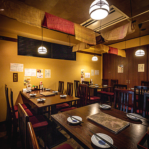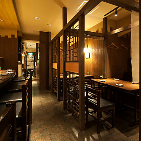 「中目黒の隠れ家」と称される、洗練された和の雰囲気が魅力です。落ち着いた照明とゆったりとした席配置で、美食を心ゆくまでご堪能いただけます。また、半個室のお席も多数ご用意しており、大切な方とのデートや記念日など、特別な日のご利用にも最適♪少人数から大人数のお集まりなど、様々なシーンでご利用ください。