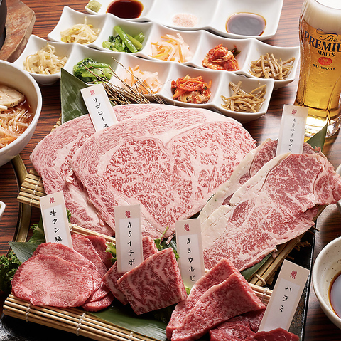 ・キムチとナムルの5種盛り合わせ・自家製胡麻ドレッシングサラダ・焼肉盛り合わせ A5黒毛和牛薄切りリブロース、和牛薄切りサーロイン~卵黄だれ~×1枚牛タン塩、牛ハラミ、A5黒毛和牛(イチボ、カルビ)各2枚 ・選べるお食事(石焼ビビンバorそば粉入り冷麺orライススープ)・旬のシャーベット