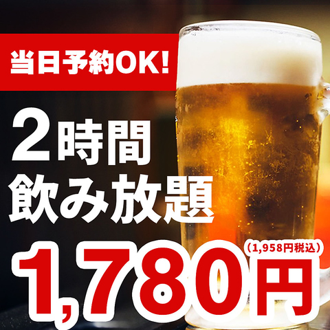 コースじゃなくても飲み放題OK!生ビールやハイボール含むドリンクが2時間飲み放題1,958円(税込)とお得!