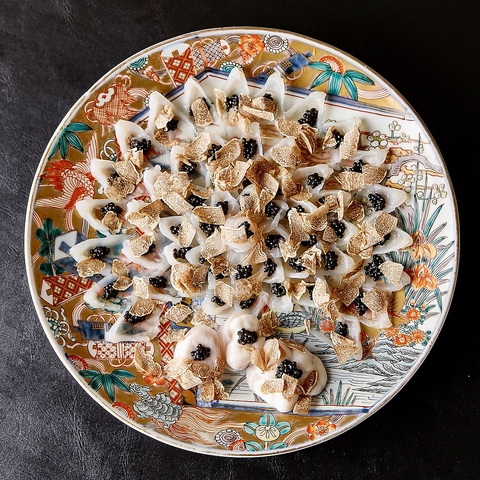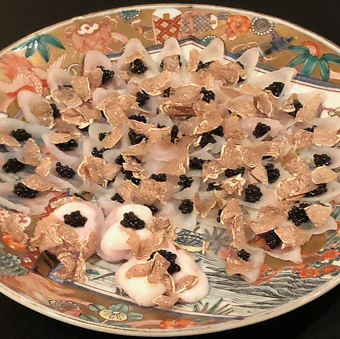 白トリュフとキャビアを贅沢に添えた、天然とらふぐのてっさ。希少な味わいを堪能できる特別な逸品です。