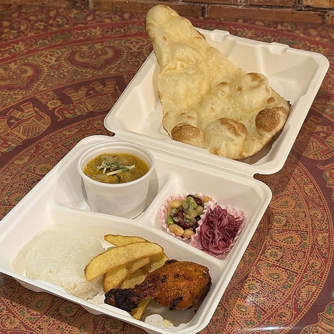 月曜日から金曜日までの平日12:00から14:00まで販売のリーズナブルなお弁当はチキンカレー又はチキンキーマカレーの2種類。甘口バーベキューのマライティッカと甘酢ショウガを添えた白米でのご提供,ライス大盛プラス54円(税込)。ガンジー自慢の大きなナンをご希望の場合、本日のおすすめカレーを始めとするランチメニューのセットがおすすめ。