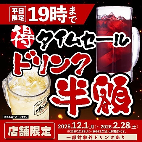 平日(月~金)限定で、対象店舗にて人気ドリンクのお得なタイムサービスを実施します。ハイボール各種をはじめ、サワー、焼酎、梅酒、カクテルまで幅広くご提供。平塚・本厚木などは16~19時、相模原・湘南台などは17~19時で開催。詳しくは安安ホームページで※年末年始対象外期間あります
