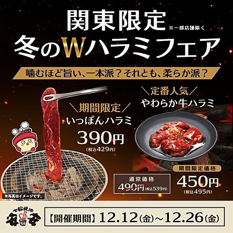 関東エリア限定で「冬のWハラミフェア」開催。豪快に焼き上げる期間限定“いっぽんハラミ”と、炭火と相性抜群の“やわらか牛ハラミ”を特別価格でご提供します。異なる味わいを一度に楽しめる冬だけの食べ比べ企画。期間中は「安安コース」「DXコース」の食べ放題でも両方をお楽しみいただけます。