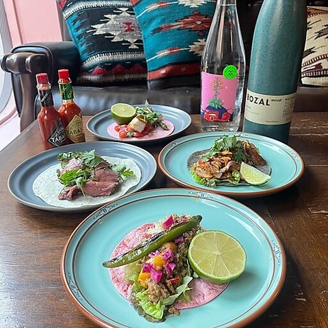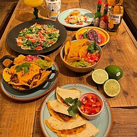 tijuana【ティファナコース】コース、前菜3種類とタコスが3種類のメニューです♪コースは、ワカモレと自家製トルティーヤチップス サルサとコリアンダー添え、メキシカンポテトサラダ、pile特製メキシカンコブサラダ とろり温玉のせ、本日のタコス3種にビール有りの飲み放題が付いており、ボリュームも満点です。