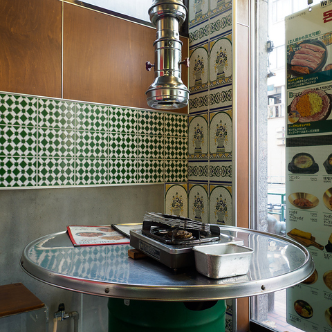 リニューアルした美しい店内には、ドラム缶の丸いテーブルを設置しました。テーブルの焼き台周辺には、脂が飛ばないようにステンレス製の油跳ねガードを設けており、快適にお食事が楽しめます。さらに、排煙ダクトも完備しているので、においも気にせず安心してご利用いただけます。