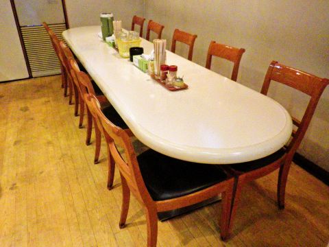 ファミリーに人気の広めのテーブル席。子どもと一緒にゆったり伝統のラーメンを頂ける。