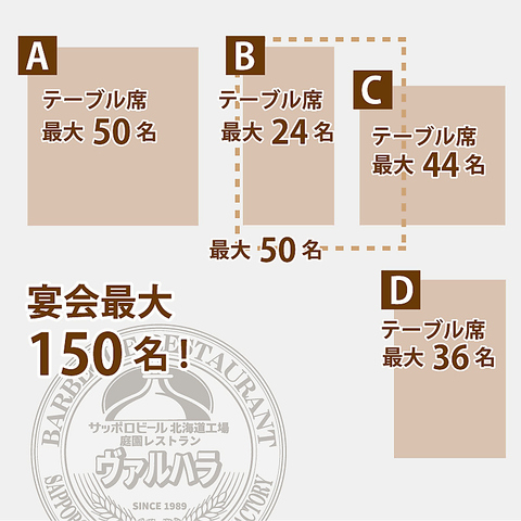 A+B+C+D)開放感抜群の広々としたフロアが魅力です。最大150名様までの大規模な貸切宴会に対応しており、会社行事や団体の打ち上げ、観光でのご利用に最適。新鮮なビールとジンギスカンを囲み、大人数で活気あふれる特別なひとときをお楽しみください。