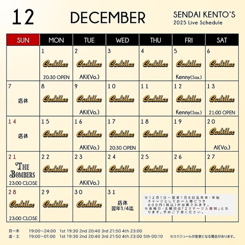 12/1~翌年1/8の期間は特別チャージとしてお一人様600円(税込)が加算※12月の金・土は2ステージ入替制