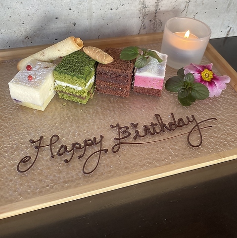 happy birthdayやwedding anniversary などプレートにメッセージを入れて記念日やお祝いのサプライズをお手伝いいたします。※ネット予約時に予約入力の下欄「お店へのご要望」にプレート希望とご記入し、誕生日・結婚記念日など、お祝いの目的とメッセージ内容もご記入ください。