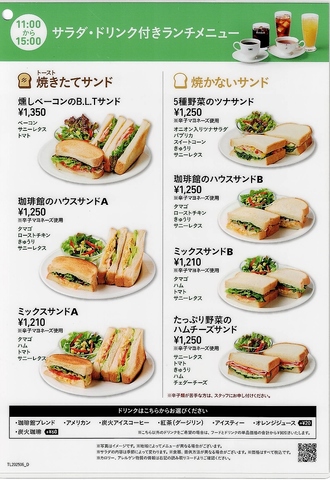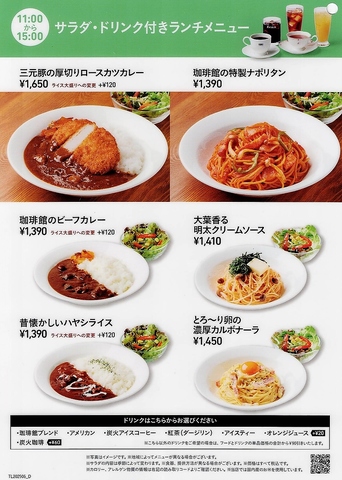 珈琲館のランチは全てサラダとドリンク付き!ドリンクは【珈琲館ブレンド・アメリカン・炭火アイスコーヒー・紅茶(ダージリン)・アイスティー・オレンジジュース】よりお選び頂けます。+80円(税込)で炭火珈琲に変更が可能です◎また上記以外のドリンクをご希望の方は、フードとドリンクの単品合計から110円(税込)引き致します♪