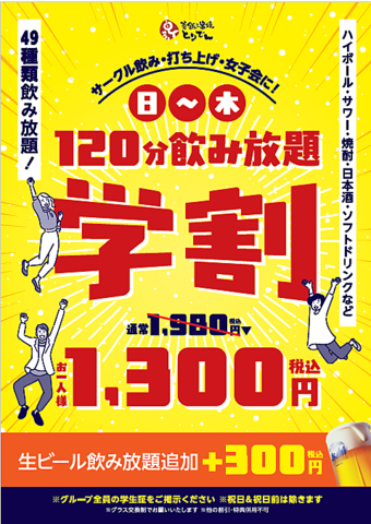 日~木(祝日除く)限定学割飲み放題1,980⇒1,300円が新登場★+300円で生ビール飲み放題も追加OK!!