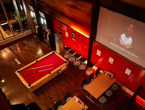 1階は個室席とフロアスペースをご用意。こちらは2名様~4名様に最適!デートや会食に利用してください。フロアスペースにはダーツやビリヤードもご用意しております♪少し気分転換に遊んでみてはっ??大きい空間の壁には大型スクリーンもあり、パーティーやサプライズの演出に大活躍♪ 2階は宴会場!50名まで入れます。