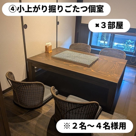 「プライベートな空間で、語らいと美食を。」周りを気にせずゆったりと寛げる、和モダンな掘りごたつの個室。木の温もりを感じるテーブルの中央には、本格的な囲炉裏(いろり)を完備。大切な方との記念日や、ビジネスでの大切な会食に、上質なひとときを演出します。