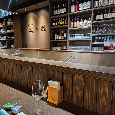 「美酒が並ぶ特等席。今夜の一杯を見つける。」カウンター席は、お一人様や、お酒をゆっくり愉しみたい方のための特等席です。職人の手さばきを眺めながら、自分だけの一杯に酔いしれる夜を。