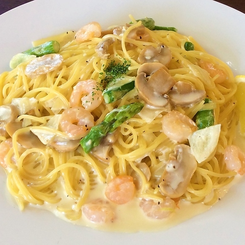 濃厚でクリーミーなソースでありながら、レモンの爽やかな香りがアクセントになり洗練された味わいのパスタ。エビとアスパラガスの彩り豊かな組み合わせが、目にも舌にもご馳走です。クリームがパスタにしっかりと絡み、ひとくちごとに豊かな海の幸と野菜の甘みが広がります♪