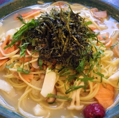 風味豊かな鮭と旬のキノコの旨味が熱々の出汁と絡み合い、お茶漬けのようなサラサラとしたのど越しを楽しめるパスタです。梅、わさび、明太子の3種から選べるアクセントが味の深みを一層引き立てています◎和と洋が融合した、あっさりとしていながらも満足感のあるひと皿です。