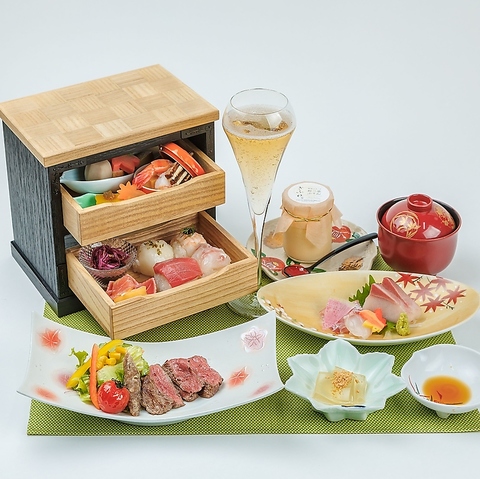 特注で製作された桐たんすの中には、彩り豊かに旬の新鮮な海の幸や色とりどりの小鉢を盛り付け。和の粋が詰まった、心満たされるひとときをお届けします。