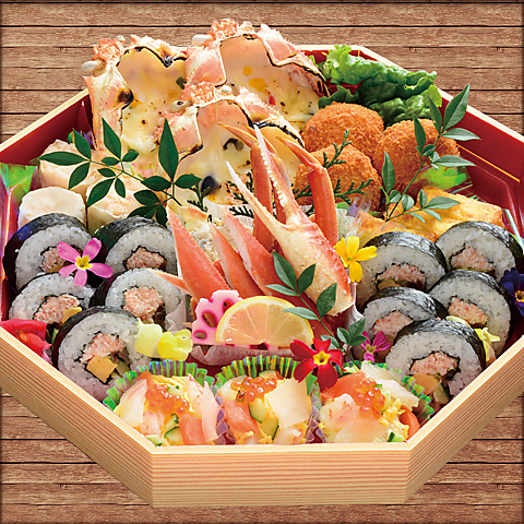 茹でズワイ半身、かに太巻き10貫、てまり寿司3貫、カニコロッケ3個、かに湯葉シューマイ3個、かにグラタン3個、だし巻きカニあんかけ3貫入ってます。【前日までに要予約】