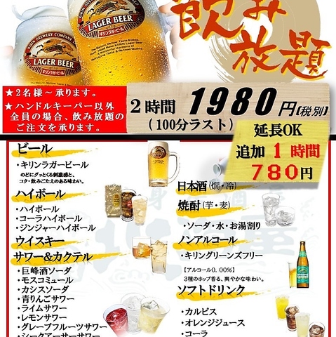 | 飲み放題 | あり :期間限定!!+2178円(税込)で飲み放題がお付けできます! |