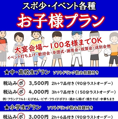 スポ少・イベント各種【お子様 宴会プラン】3000円~4000円(税込)<ソフトドリンク飲放題付>大宴会~100名様までOK♪イベント打ち上げ・歓迎会・卒団式・謝恩会・祝賀会・送別会他※大人を含むグループ予約の場合、大人は別のコースのご予約をお願い致します。ご料金についてはご連絡ください。