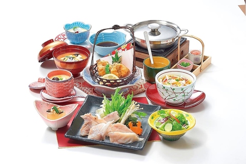 かにとふぐの贅沢昼膳●かにふぐ一人鍋●ふぐ刺身●かにとふぐの寿司盛り合わせ●茶碗蒸し●お椀●デザート ※日・祝日のご用意はございません。※写真はイメージです