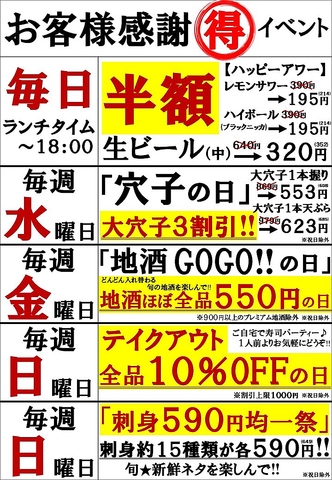お客様皆様への感謝を込めまして♪毎日・毎週恒例のイベントを開催しております!是非お得にご利用ください