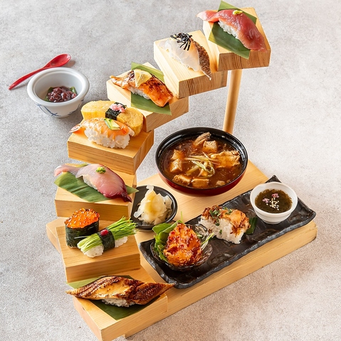 見ても食べても豪華!!!おすすめ階段ランチ●寿司(名物焼き穴子・サーモン焦がし醤油炙り・いくら軍艦・旬のおすすめ寿司四貫)●本日のおかず盛●名代具沢山赤だし●手作りデザート
